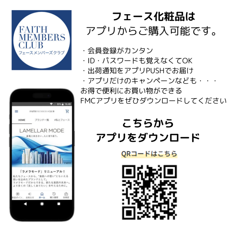 当店でお取り扱いしておりますフェース化粧品はアプリをダウンロードして会員登録すればご購入が可能です🌈会員登録後にはフェースから季節のお手入れのコツなど美しくな... -